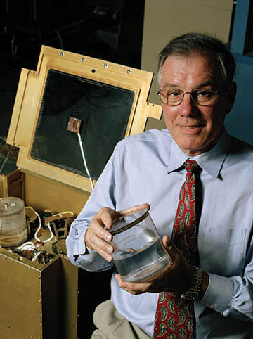 Retiree Dr. Franklin Dodge holds one of the tanks used in SwRI’s liquid motion experiment conducted onboard the space shuttle in 1997. The scale-model experiment led to the development of a full-scale spinning slosh test facility.
