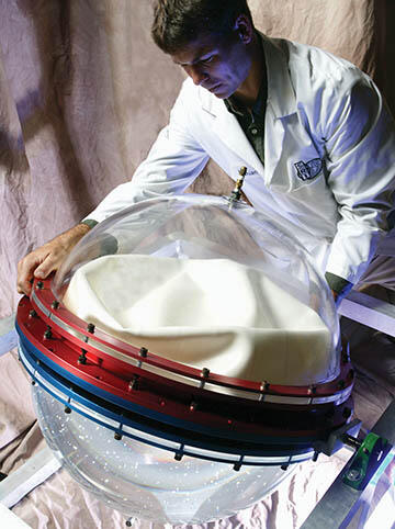 SwRI evaluates the effects of fluid motion in spacecraft propellant tanks, such as this full-scale model of a tank with a damping internal diaphragm used on the New Horizons and Deep Impact spacecraft. Our engineers design test tanks to match closely the internal design features of spacecraft tanks, while providing access for sensors and allowing visual observations.