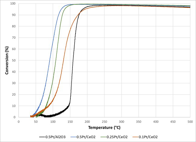 Figure 2: Conversion of 500 PPM CO in 12% O2 and balance N2 with a total flow of 3 L/min.