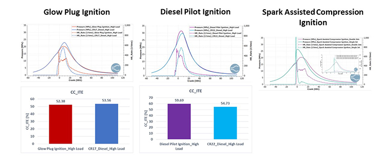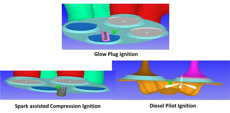 Computational fluid dynamics simulations of three compression-ignition concepts were carried out (see Figure 1): glow-plug assisted ignition, spark-assisted ignition, and diesel pilot ignition. These simulations were run using a baseline diesel engine combustion system and predicted indicated thermal efficiency of the combustion process and the emissions from combustion.