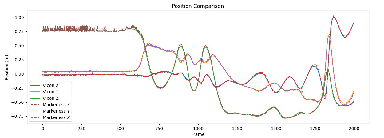 Over the course of this IR&D project, we constructed a data capture pipeline leveraging multiple motion capture systems and collected a comprehensive dataset of object motion. Furthermore, we developed a robust 3D object tracking pipeline which produces accurate 3D object trajectories and supports a variety of object types. Figure 2 compares the baseball bat trajectory generated by our 3D tracking pipeline with the ground-truth trajectory obtained using a traditional motion capture system. While further work will explore expanding this approach to provide full 6 degree-of-freedom (DOF) object poses, this effort represents a significant advancement in object tracking research.