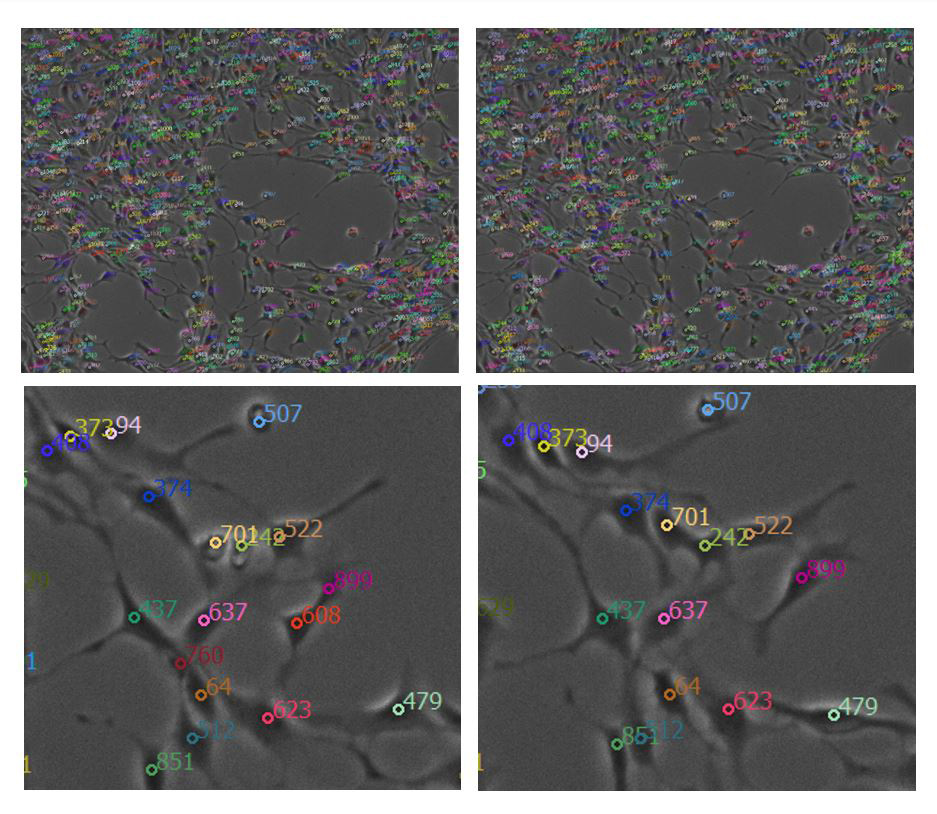 Figure 3: Detected soma automatically tracked from timestamp 1 (top left) to timestamp 2 (top right). A zoomed-in example from the same timestamps are shown in the bottom left and right images, respectively. Each soma is numbered and colored to visually assess how well the algorithm tracked individual neurons over time.