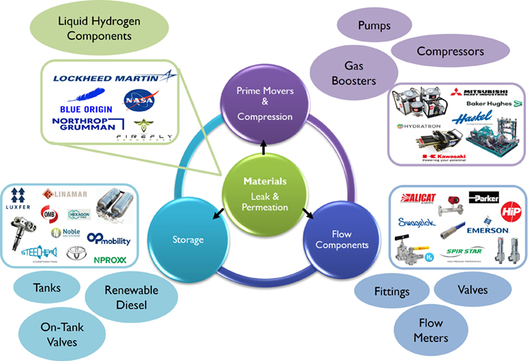 Figure 2: There are three main hydrogen component categories identified, and examples of components and potential customers are provided for each category. Components are made from materials that need to be evaluated for compatibility, leak, and permeation, especially for cryogenic liquid hydrogen in the aerospace industry.