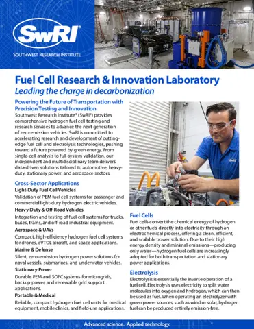 Fuel cells powered by hydrogen cleanly and efficiently generate electricity, producing no harmful pollutants — just water. These green energy sources are becoming increasingly popular not only for the automotive applications but also for stationary and portable power generation. Southwest Research Institute offers a dedicated fuel cell research and testing laboratory to help industry professionals develop new fuel cell technologies and improve the performance of existing systems.