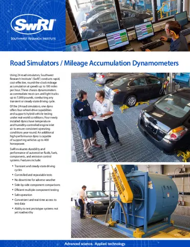 We evaluate durability and performance of automotive fluids, fuels, components and emission control systems. Features include transient and steady-state driving cycles, controlled and repeatable tests, side-by-side component comparisons, efficient multiple component testing, convenient and real-time access to test data and the ability to test prototype systems not yet roadworthy.