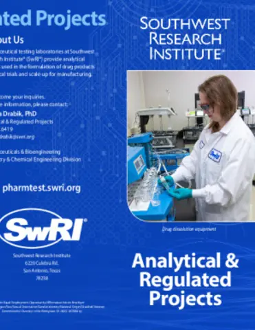 Pharmaceutical drugs are developed through a highly regulated process to ensure that a drug product, substance or formulation meets health and safety standards. Pharmaceutical testing laboratories provide analytical services used in the formulation of drug product for clinical trials and scale-up for manufacturing. Southwest Research Institute (SwRI) provides fully compliant facilities that support the testing, characterization and release of pharmaceutical products in adherence with CGMP manufacturing standards. Learn about our CGMP Manufacturing services and the Institute’s Pharmaceutical Development department.