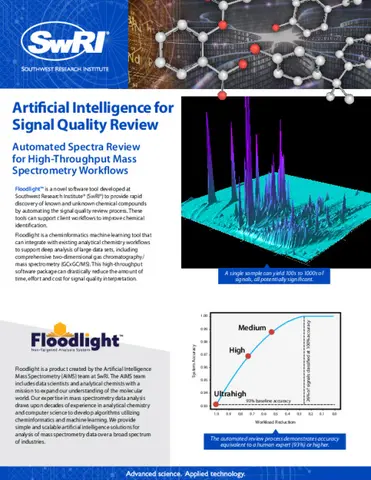 Southwest Research Institute® (SwRI®) offers non-targeted analysis using complex chromatography and Mass Spectrometry enhanced by artificial intelligence. With expertise in analytical chemistry, machine learning and data science, SwRI developed Highlight™, a novel tool to automate the signal quality review and data processing steps in a high-throughput manner. Along with extensive analytical chemistry experience of SwRI’s staff, Highlight™ works with existing instrumental acquisition software to perform non-targeted analysis.