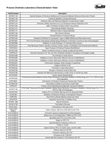 Testing methods include those specific to the National Institute for Occupational Safety and Health (NIOSH), American Society for Testing and Materials (ASTM), Universal Oil Products (UOP) methods, Organization for Economic Cooperation and Development (OECD), National Renewable Energy Laboratory (NREL), and Environmental Protection Agency (EPA).