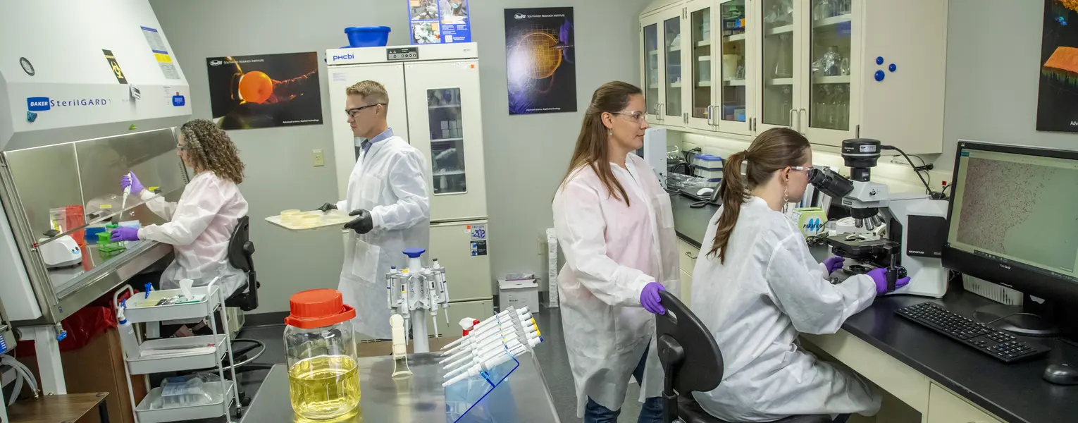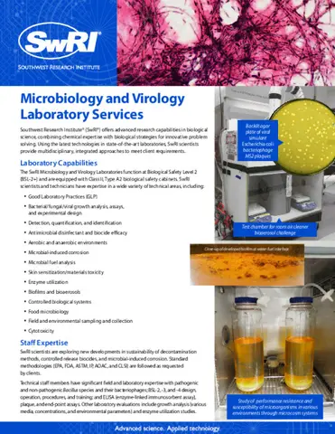 Unseen to the naked eye, microbes play a very important role in shaping the environment, materials and human health. Science and innovation, in the fields of microbiology, at Southwest Research Institute (SwRI) help government and industry understand microbes while solving complex challenges in healthcare, homeland security, medical device production, materials design, and energy and environmental applications. Our independent microbiology and virology laboratories draw upon expertise in life science, bacteriology, molecular genetics, medicine, and chemistry pillars to provide applied R&D and testing solutions.