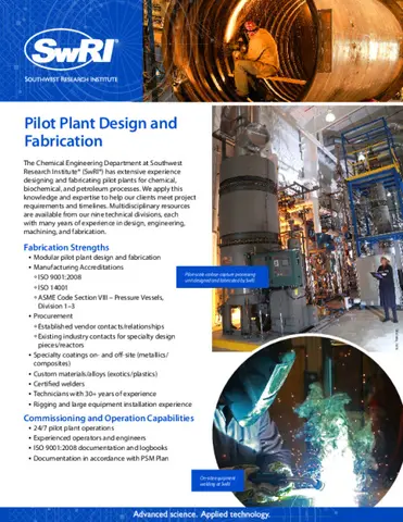 Southwest Research Institute (SwRI) designs and develops chemical pilot plants that scale ideas into working platforms for research and development in fuels refining, renewable energy, power generation, chemical processing and more.