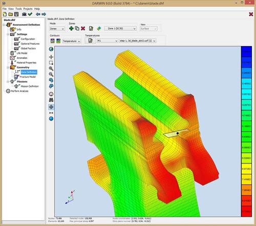 - Hotspot detection – Risk limiting regions may occur in non-intuitive locations due to combinations of geometry, stress, temperature, and material property factors. DARWIN computes life contours and risk contours throughout components to detect critical regions for crack growth and fracture.