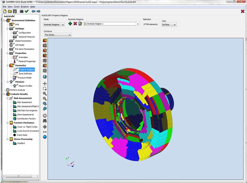 - Life and risk estimates for components with inherent anomalies – Metallic components may have internal anomalies that can act as crack pre-cursors. These anomalies are often randomly distributed throughout the geometry and can lead to fracture. DARWIN enables users to quantify the fracture risk by simulating crack growth histories with uncertainties in initial crack sizes, input stresses, material properties, and inspection parameters.