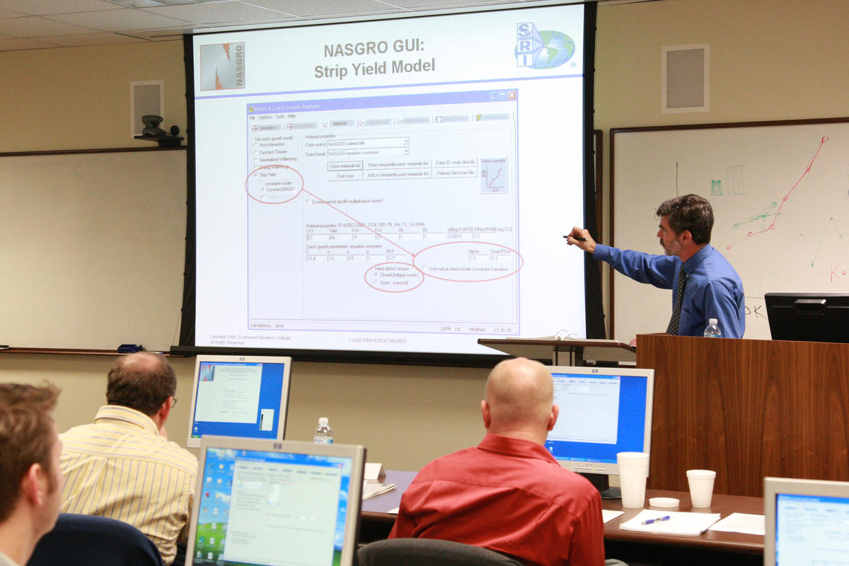 Upon request, the SwRI team is available to present the NASGRO course at client sites, or to offer dedicated live virtual classes for individual organizations. Costs to present those courses depend on course duration and location. These fees support the actual expenses of staff time, travel (if required), and reproduction of curriculum materials. The content and length of the course can be tailored to your specific needs. For more information about NASGRO classes for individual organizations, contact Joe Cardinal.