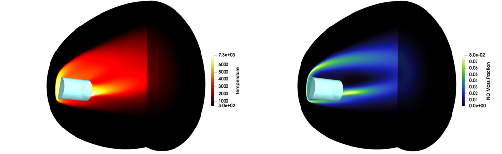 Simulation of hypersonic test article flying at 5.5 km/s (Mach 16). Image on left shows hot gases around test article. Image on right shows local concentration of nitric oxide gas that forms within the shock layer of vehicles at hypersonic speeds.