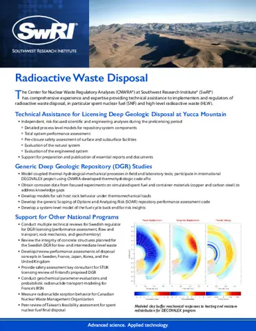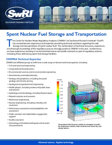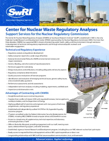 SwRI provides technical evaluations in support of the licensing, inspection, and maintenance of facilities used across the nuclear fuel cycle. These evaluations are conducted by staff in the Center for Nuclear Waste Regulatory Analyses (CNWRA), a federally funded research and development center established in 1987 by the U.S. Nuclear Regulatory Commission (NRC). SwRI also offers a team of mechanical engineering experts who focus on nondestructive evaluation of nuclear reactors in compliance with federal and international regulations, as well as engineers and scientists who specialize in failure analysis of electrical, hydraulic, and mechanical components.