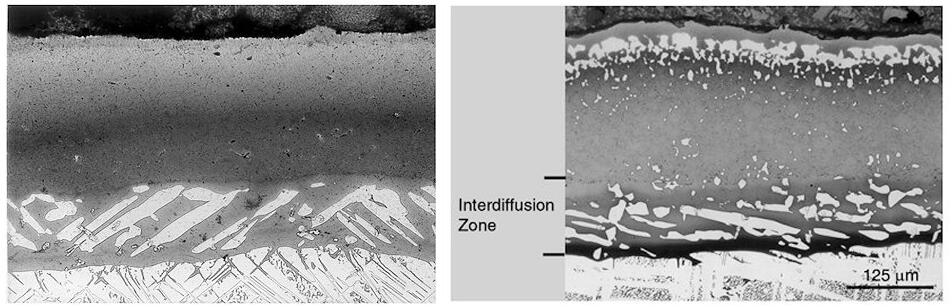 The images above show in-service degraded coating of a 7FA blade (first image) and a 9FA blade (second image) after 21,000 hours of service.