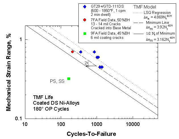 In gas turbines, the life and integrity of the coatings, applied to protect the components from environmental attack and degradation, govern the life and maintenance intervals of hot section components. SwRI has developed state-of-the-art coating and TMF life prediction methods for several substrate/coating systems. The TMF model has been calibrated with service experience and can be used to predict the life of a specific coating on turbine blades in service.