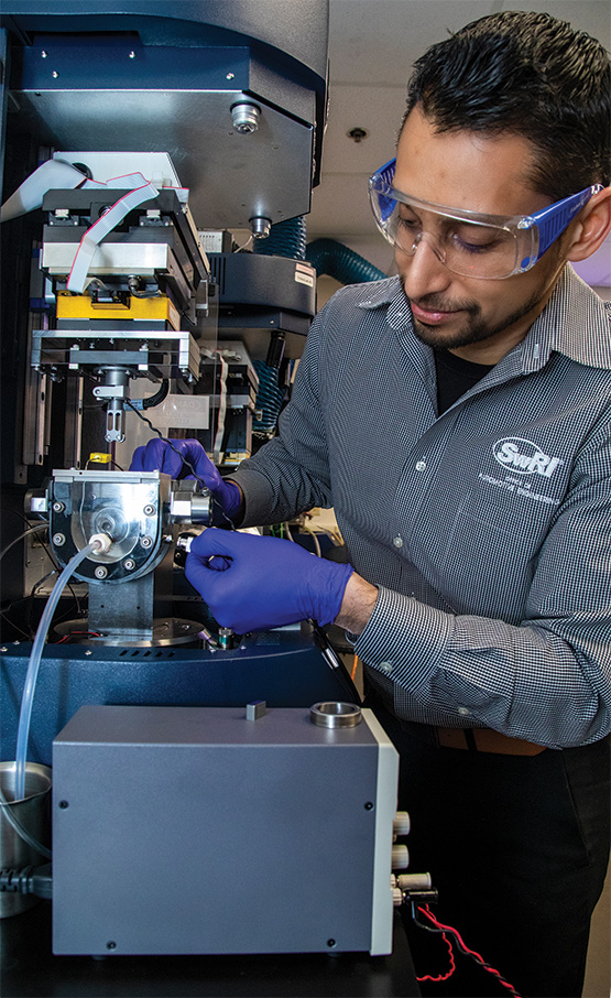The Institute’s cost-effective bench-scale testing capabilities allow clients to test multiple lubricant formulations efficiently, accelerating lubricant optimization, improving hardware durability and increasing vehicle range through reduced friction. Similar benchtop efforts are ongoing, with SwRI engineers working to modify an industry standard oxidation test to include testing for oxidation in an electrified environment.