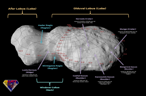 The asteroid’s smaller lobe is called the Afar lobe after the Ethiopian region where Lucy and other human ancestor fossils were found. The large lobe is named the Olduvai lobe after a Tanzanian river gorge. The neck connecting the two lobes was named after the Windover Archeological Site near Cape Canaveral, Florida, where Lucy was launched in 2021. This is the first time the IAU has recognized an asteroid neck as an officially named feature. Additional features include two smooth areas on the neck named the Hadar region, after the site of the Lucy fossil’s discovery, and the Minatogawa region, where the oldest known hominins in Japan were found.