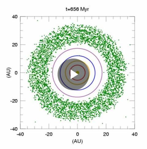 The team used numerical simulations to show that some comet-like objects residing in a disk outside the original orbit of the planets were scattered across the solar system and into the outer asteroid belt during a violent phase of planetary evolution.