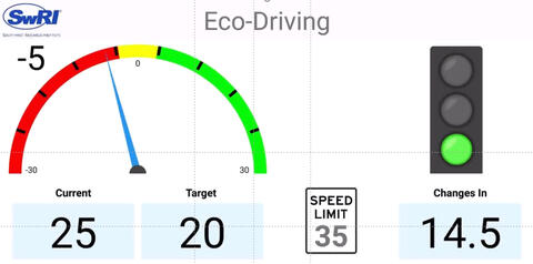 SwRI engineers used internal funding to deploy the eco-driving technology in a mobile driver advisory application, or “app,” that runs on regular smart phones or tablets. The driver advisory app connects with traffic lights and roadway infrastructure to “see” up to half a kilometer ahead and alert drivers to drive more efficiently. For example, if a stoplight is red a few blocks ahead, the app will tell the driver to speed up or slow down by a few miles per hour to avoid stopping. For heavy-duty trucks, making a full stop at a red light and re-engaging the engine when the light turns green is a significant source of fuel consumption.