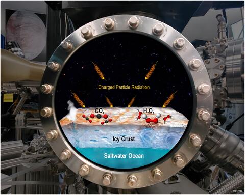 “We simulated the surface environment of Europa inside a vacuum chamber by depositing water ice mixed with CO2,” Mamo said. “We then irradiated this ice mixture with energetic electrons to see how the peroxide production changed.”