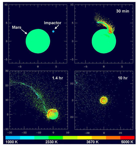 “Ours is the first self-consistent model to identify the type of impact needed to lead to the formation of Mars’ two small moons,” said lead author Dr. Robin Canup, an associate vice president in the SwRI Space Science and Engineering Division. Canup is one of the leading scientists using large-scale hydrodynamical simulations to model planet-scale collisions, including the prevailing Earth-Moon formation model.