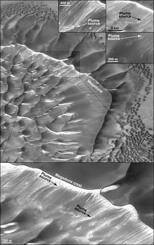 The airborne plumes consist of fine dust disturbed by the sliding block, whereas coarse dust is redeposited near the gullies, creating a seasonal, relatively bright fringe around active gullies. The off-gassing ice blocks temporarily clean dust from the dark gully sand, resulting in telltale brightness (albedo) variations in and around gullies.