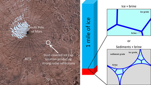 January 25, 2022 — A Southwest Research Institute scientist measured the properties of ice-brine mixtures as cold as -145 degrees Fahrenheit to help confirm that salty water likely exists between grains of ice or sediment under the ice cap at Mars’ south pole. Laboratory measurements conducted by SwRI geophysicist Dr. David Stillman support oddly bright reflections detected by the MARSIS subsurface sounding radar aboard ESA’s Mars Express orbiter.
