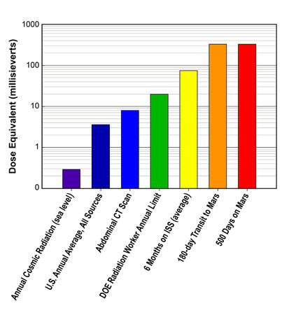 According to RAD data, most mission radiation exposure will be during outbound and return travel, when the astronauts will be exposed to the radiation environment in interplanetary space, shielded only by the spacecraft itself. The total during just the transit phases of a Mars mission would be approximately 0.66 Sv for a round trip with current propulsion systems and during similar solar activity. A 500-day mission on the surface would bring the total exposure to around 1 Sv.