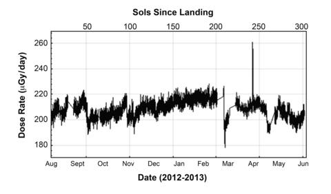 “The RAD surface radiation data show an average GCR dose equivalent rate of 0.67 millisieverts per day from August 2012 to June 2013 on the Martian surface,” said Hassler. Radiation dose is measured in units of sievert (Sv) or millisievert (1/1000 Sv). “In comparison, RAD data show an average GCR dose equivalent rate of 1.8 millisieverts per day on the journey to Mars, when RAD measured the radiation inside the spaceship.”