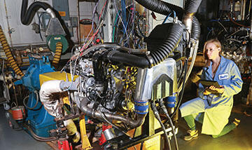 SwRI outfitted this new test cell with an electrically regenerative loading system to push power generated by the engine to SwRI’s grid, reducing the Institute’s electrical burden. Engineers use the Class 8 truck test cell to develop next-generation diesel lubricants, evaluating lubricant performance across the engine’s entire operating range.