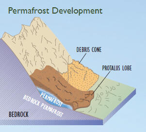 Rock glaciers can be observed in various stages of activity in places such as Rocky Mountain ski resorts and the Andes of South America. Like landslides moving at a glacial pace, these geomorphological formations consist of jagged rock fragments insulating a core of ice or ice-debris mixture that travels down steep mountains over thousands of years.