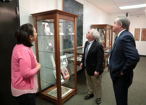 Chuck Slick, center, tours the SwRI Archives, with SwRI President and CEO Adam Hamilton and Institute Archivist Anissa Garcia. Historical SwRI documents, publications, images and pieces from Tom Slick’s art collection are preserved in Archives.