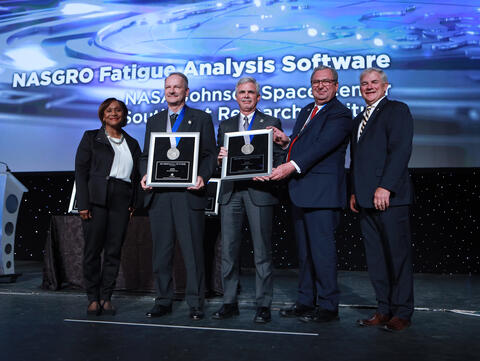 Courtesy of Space FoundationFrom Left to Right: Vanessa Wyche, NASA’s Johnson Space Center director and Hall of Fame induction ceremony keynote speaker, Joachim Beek, NASGRO lead at NASA JSC and Hall of Fame inductee, Dr. Craig McClung, SwRI NASGRO developer, Joe Cardinal, SwRI NASGRO developer and Tom Zelibor, Space Foundation CEO.