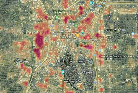 This map of San Antonio illustrates the distribution of urban heat islands (red) near downtown. Southwest Research Institute has created a comprehensive data analysis tool to help the city identify urban heat islands and pursue viable mitigation methods for especially vulnerable populations.