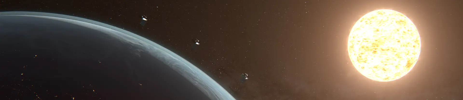 Now, when you think on a planetary scale and you think about orbits, sunset is not a time. Sunset is a place. So we are always right over that sunrise-sunset line on the planet as we orbit around in a polar orbit. So we go from north to south, skimming that line so that every spacecraft is always in the sun, looking sideways out across the Earth toward the star itself.