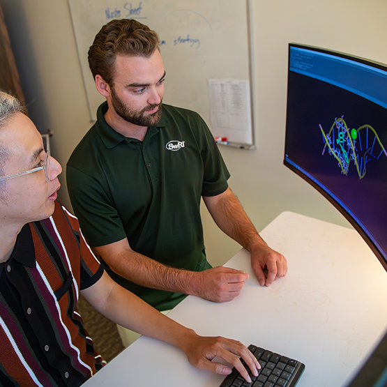 SwRI’s drug discovery team wears 3D glasses to visualize the protein crystal structure of diseases in three dimensions to understand how an inhibitor compound may bind to the disease to prevent spread. The 3D analysis of the disease structure is performed using Rhodium software.