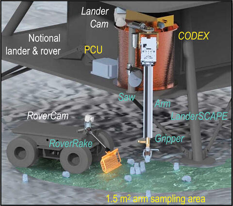 A camera, sample collection arm and the CODEX instrument will remain on the DIMPLE lander, while a rover equipped with a camera and rake will scoop and transport samples back to the lander instruments for detailed study.