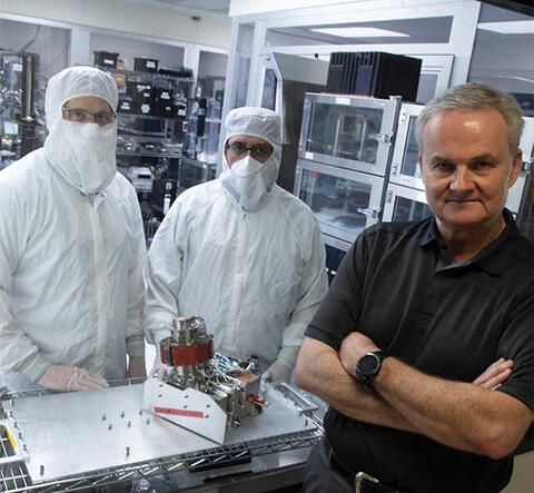 From right, Dr. Jörg-Micha Jahn, MAPS lead investigator, looks on as Benjamin Rodriguez and James Noll prepare the instrument for delivery and integration into NASA’s Lunar Vertex lander. MAPS will gather sensitive, high-resolution insights about the Moon’s surface, offering more than four times the resolution of orbital instruments, while weighing just 11 pounds (five kilograms) and drawing less than 6 watts of power.