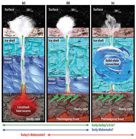 Using data from the James Webb Space Telescope, SwRI modeled the subsurface geothermal processes that could explain how methane ended up on the surfaces of Eris and Makemake, two dwarf planets in the distant Kuiper Belt. The illustration points to three possibilities, including the potential that liquid water exists within these icy bodies at the edge of the solar system, far from the heat of the Sun.