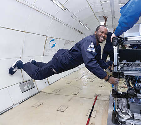 Aboard a parabolic flight, SwRI Research Engineer Dr. Eugene Hoffman floats in partial gravity while conducting a fluids engineering experiment to better understand how liquids boil in low gravity.