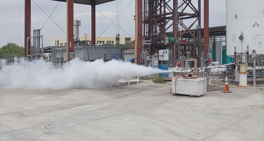 For safety reasons, SwRI used liquid nitrogen as a substitute for liquid natural gas and simulated the conditions the safety pressure valve would undergo in a train derailment.