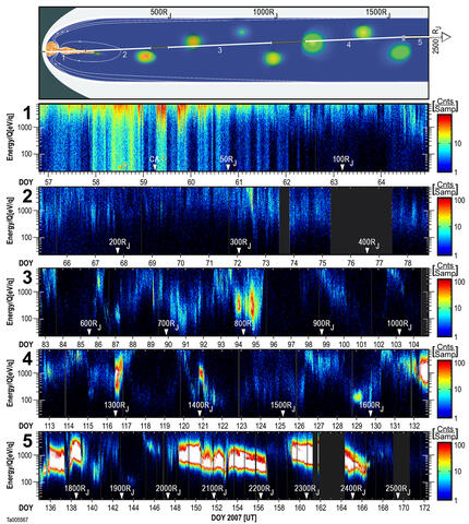 Oct. 9, 2007 — During the first traversal nearly straight down any planet's magnetotail, the Solar Wind Around Pluto (SWAP) instrument aboard New Horizons gathered remarkable new data on the magnetospheric bubble that surrounds Jupiter. The encounter, a bonus science mission for the Pluto-bound spacecraft, occurred as it rounded the planet in February 2007 for a gravity assist to help speed its journey to the edge of the solar system.