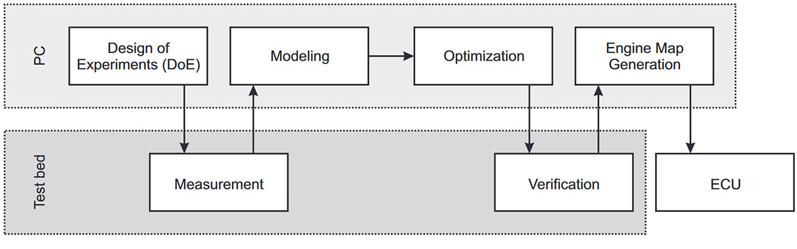 Figure 1: Flowchart of a typical model-based calibration process. SwRI is already well-versed at the test bed measurement aspect; this IR project attempted to reduce risk in the other steps, namely, DOE, Modeling, and Optimization.