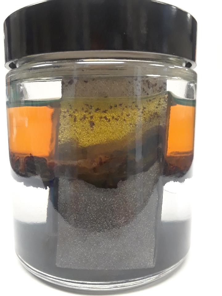 Figure 2: Static corrosion testing set up in a glass jar. The steel coupon is exposed to three phases: aqueous, organic, and air (from bottom to top).