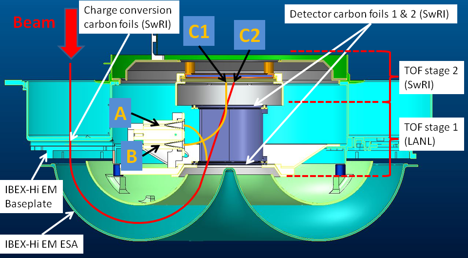 Figure 1: IMAP-Hi prototype schematic showing ion and electron trajectories.