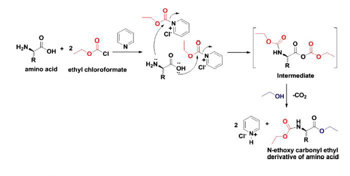 Figure 1: Mechanism for the derivatization of amino acids with ethyl chloroformate.