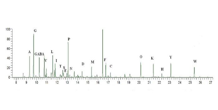Figure 2. Representative chromatogram from the SPME, ethyl chloroformate derivatization and GCMS analysis of amino acids in a aqueous media.
