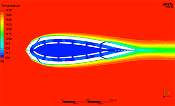 Figure 1: Results from CFD analysis of the film-cooled strut showing temperature contours in and around the test article.